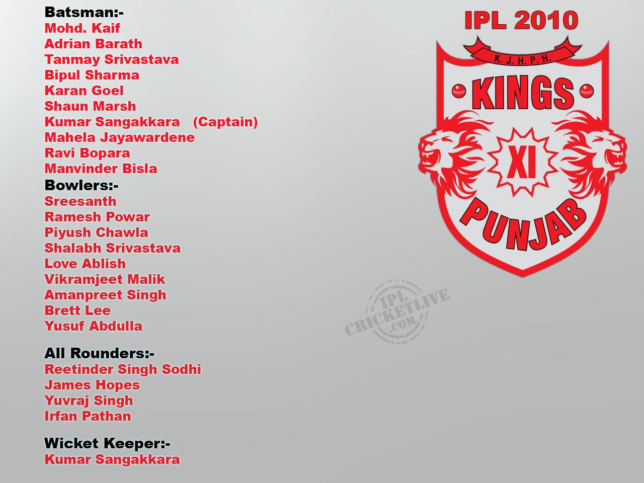 Kings XI Punjab Team Squad - IPL 20/20 Cricket Match 2010 Online